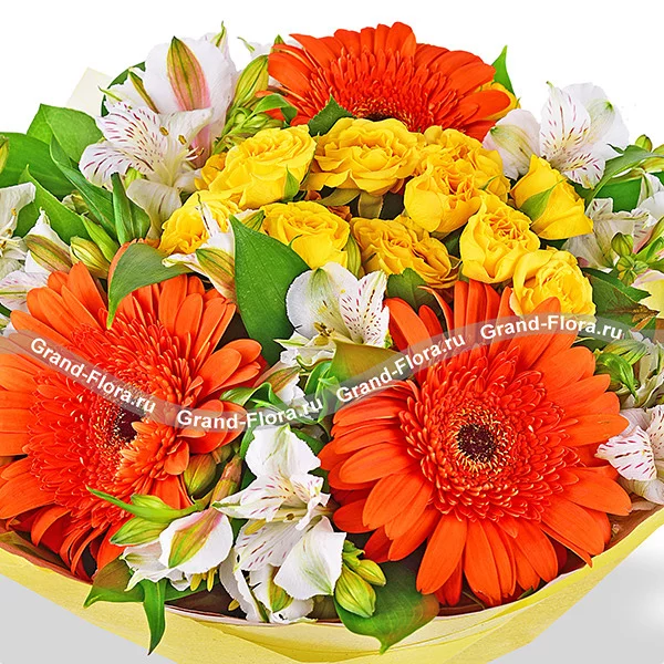 Смешанный выразительный букет из огненно-оранжевых гербер, желтых роз и нежных белых альстромерий великолепно дополнен рускусом. Яркий букет будет отличным дополнением к подарку в день рождения любимой мамы или сестры, а также выражением благодарности дорогой подруге или коллеге